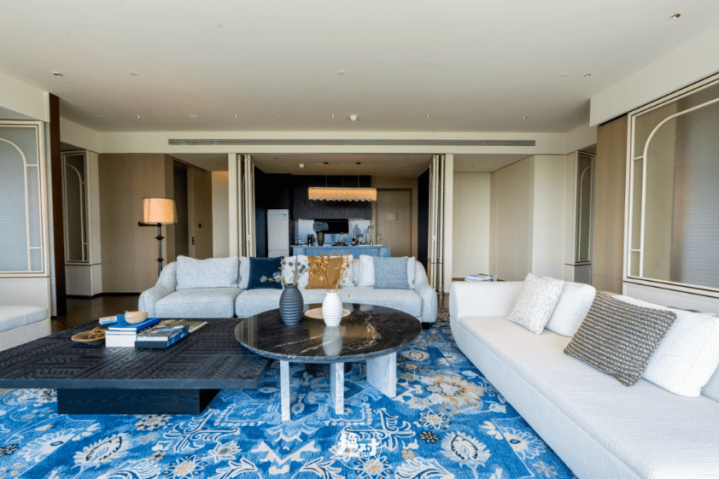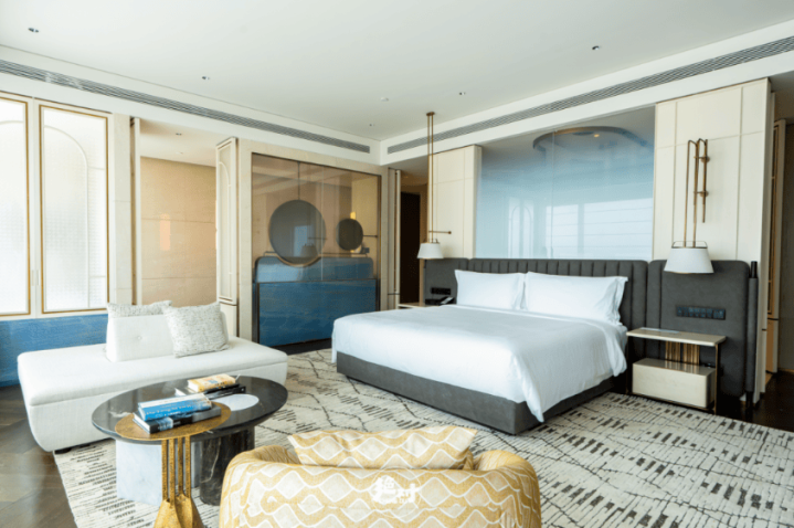 酒店拥有220间全景客房与套房,面积从48至236平方米不等,每扇落地窗均以“伊宁蓝”为点缀,站在窗前即可欣赏天山山脉和伊犁河的美景。而在窗内,则藏着对在地文化与生活方式的美学诠释:65 寸大屏幕液晶电视 、独立浴缸及步入式淋浴间、胶囊咖啡机等兼顾舒适与科技的生活设施、简约线条的定制家具,每一个细节都在回应现代旅人的生活品位。