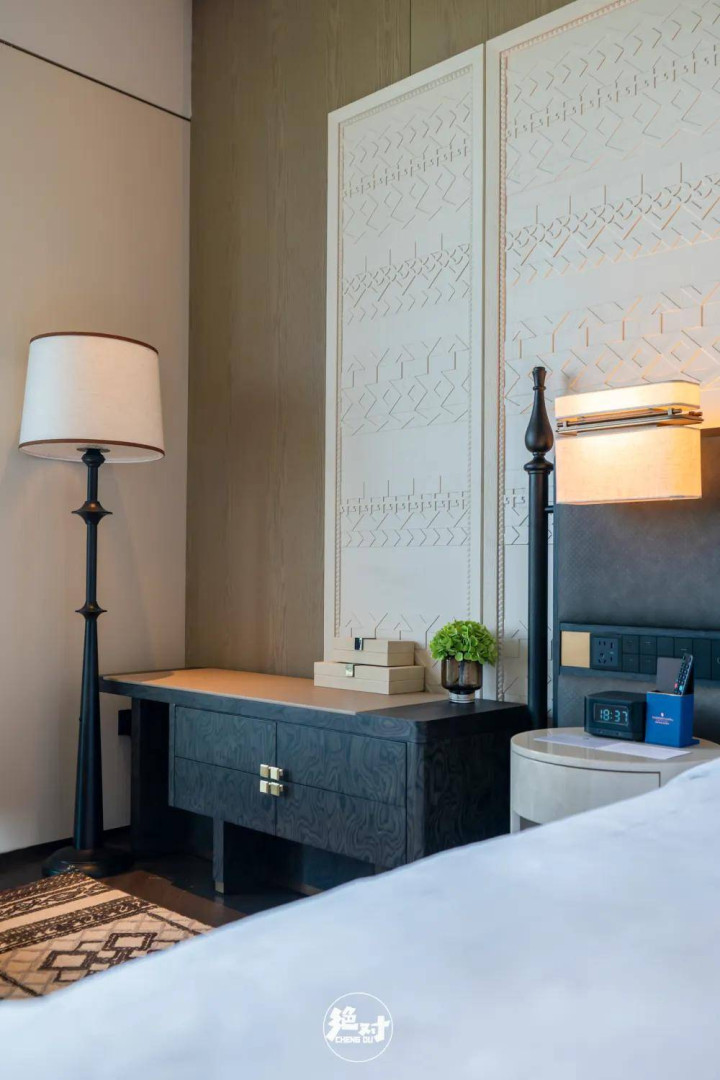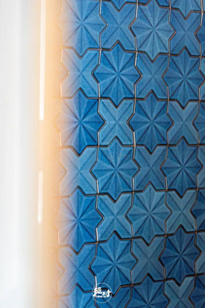 特别值得一提的是,客房中独具匠心的设计细节:洗手间推拉门延续了伊宁窗棂图案,淋浴间墙体则采用烧制的伊犁蓝色石榴花立体图样,寓意着民族交融的团结精神。床头板借鉴当地家具样式,简化后呈现出更符合当代审美的形制。而迷你吧柜体上的图案,则是一场多民族纹样的交响,浓缩伊犁文化肌理。